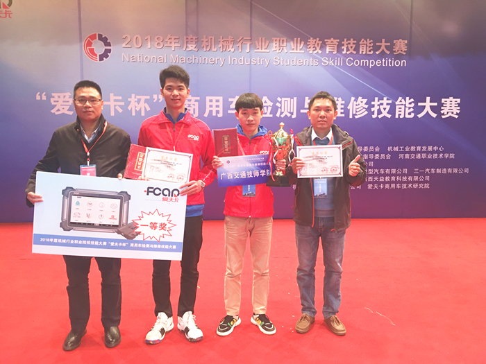 11月23-26日,由全国机械职业教育教学指导委员会、机械工业教育发展中心主办的全国机械行业职业教育技能大赛—“爱夫卡杯”商用车检测与维修技能大赛在郑州市河南交通职业技术学院举行,共有来自全国各地的35所中高职学校近百余名选手参赛。我院汽车工程系选派16级汽车维修专业黄海波和刘瑞利2名学生参加比赛,分别由汽车系张东山和黄忠前担任指导老师。