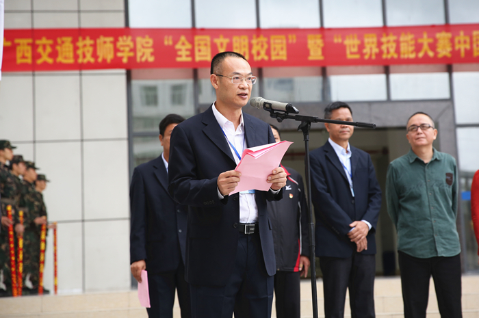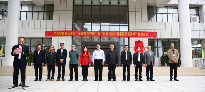 10月15日下午,我院在学院综合实训楼举行“全国文明校园”暨“世界技能大赛中国集训基地”揭牌仪式。自治区交通运输厅党组书记、厅长陈鸿起,自治区直属机关工作委员会副书记苏德明,自治区人力资源社会保障厅党组副书记、副厅长、巡视员潘志金,自治区直属机关文明办主任颜东伟,自治区人力资源和社会保障厅职业能力建设处处长杨春华,自治区交通运输厅科教处副处长张斯悦,自治区道路运输管理局书记罗华以及广西交通技师学院领导班子等出席仪式。我院院长钟修仁主持揭牌仪式。