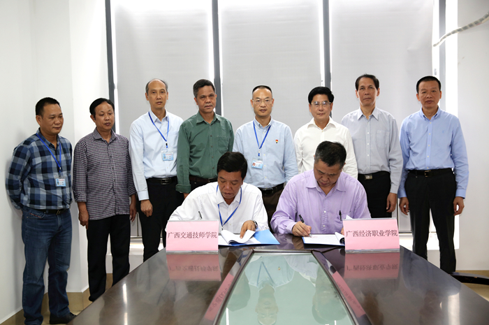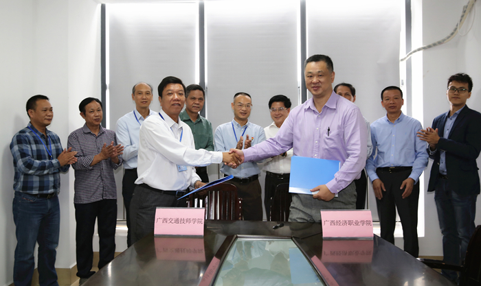 10月11日上午,我院与广西经济职业学院在学院综合楼会议室举行“校校合作”签约仪式。广西经济职业学院董事长肖开宁、院长陈俊伟等,我院院长钟修仁、党委书记古雅明等领导班子成员出席了签约仪式。