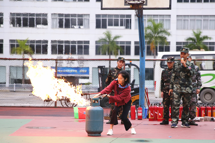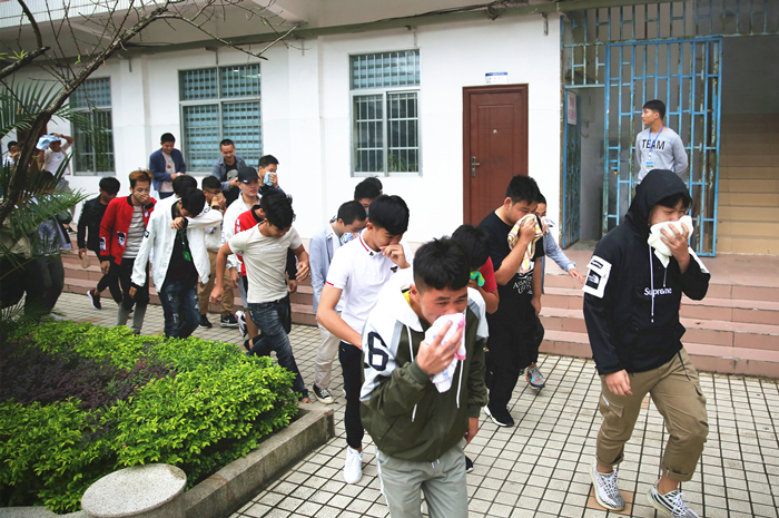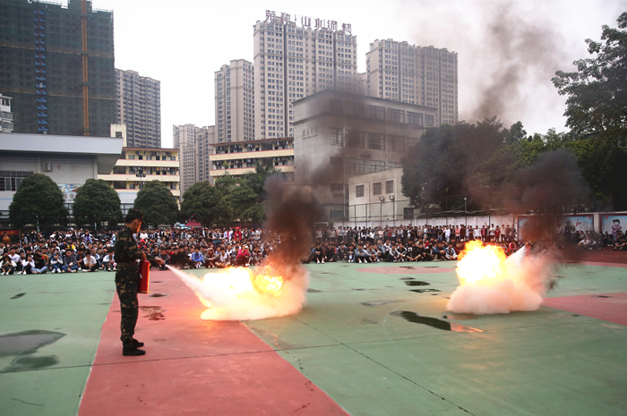广西消防总队培训基地官兵对我院全体在校学生进行了消防知识培训和灭火器使用操作演练。培训内容包括消防安全基础知识、火场自救逃生方法、火灾逃生注意事项以及灭火器使用等。下午16点整,消防逃生演练正式开始,警报声在学校内响起,学生们捂住口鼻,在教师们的引导下,沿着安全通道进行有序地疏散,快速撤离到学校足球场。