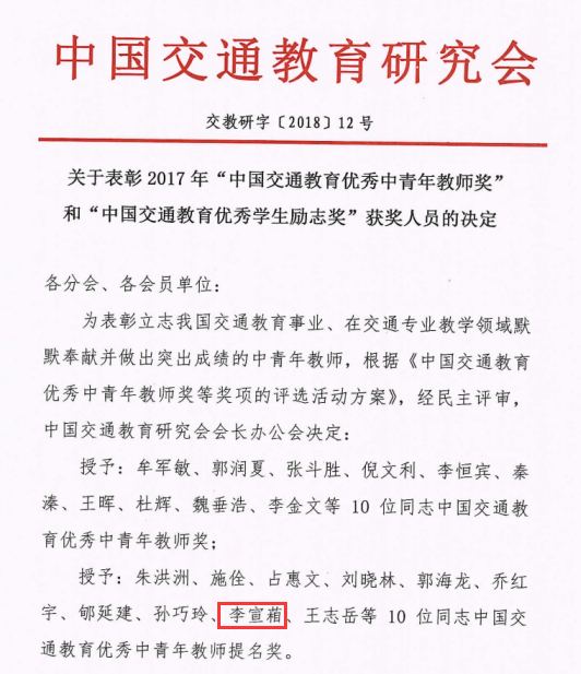 我院李宣葙老师喜获2017年中国交通教育优秀中青年教师提名奖