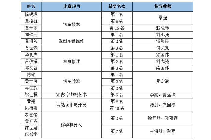近日,第45届世界技能大赛广西选拔赛圆满落幕,我院学生在汽车技能、重型车辆维修、车身修理、汽车喷漆、3D数字游戏艺术、网站设计与开发、移动机器人等7个比赛项目中取得优异成绩。