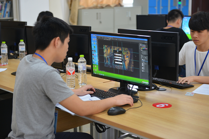 我院参加《3D数字游戏艺术》项目比赛的学生:祝远模(右一)、梁桂(右四),指导教师:李嵩(右二)、曾远锋(右三)
