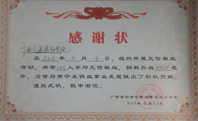 5月16日下午,我院联合南宁市中心血站在校内进行了无偿献血活动,本次献血活动得到了师生的积极响应,取得了良好的反响,让公益爱心事业走近了我们身边。