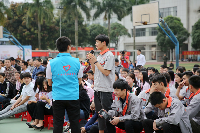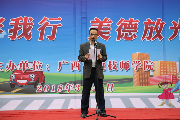 古雅明书记为活动致辞,他表示,我院自2013年创建了全国第一所安全节能文明驾驶公益学校,并逐步建成了开放公益大课堂、驾驶员综合能力测评、网络服务、文明驾驶教育示范等4个窗口基地。这些基地的建成,使安全节能文明驾驶渗透人心,促进了我院和行业主管部门、企事业单位的共同关注安全节能文明驾驶公益传播事业,造就了一支通晓安全、节能、文明驾驶知识的多样化师资队伍,形成了富有行业特色的安全节能文明驾驶公益文化。2017年,我院成为全国唯一一所荣获“首届全国文明校园”至高荣誉的全日制技工类院校,也是广西唯一一所获此殊荣的中职院校。古雅明书记希望我院师生共同珍惜、维护这份来之不易的荣誉,加强文明素养、文明习惯的养成,通过本次公益大课堂活动,牢固树立“人人需要文明交通,交通需要人人文明”的交通安全理念,巩固全国文明校园建设成果。