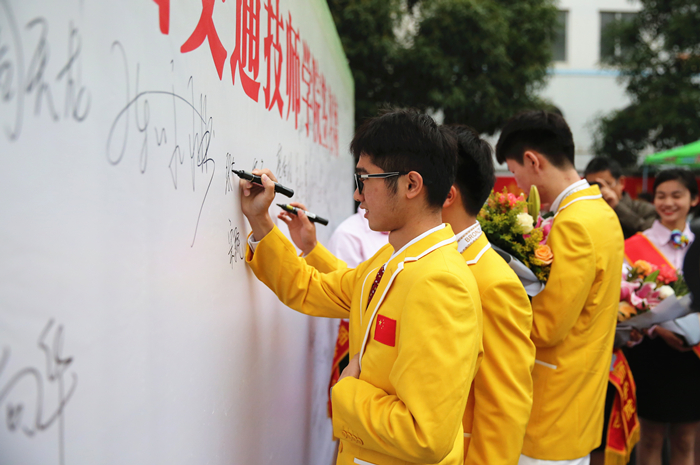 第44届世界技能大赛工业机械装调项目金牌选手宋彪、塑料模具工程项目金牌选手张志斌、移动机器人项目铜牌选手梁灶容在签名墙上签名