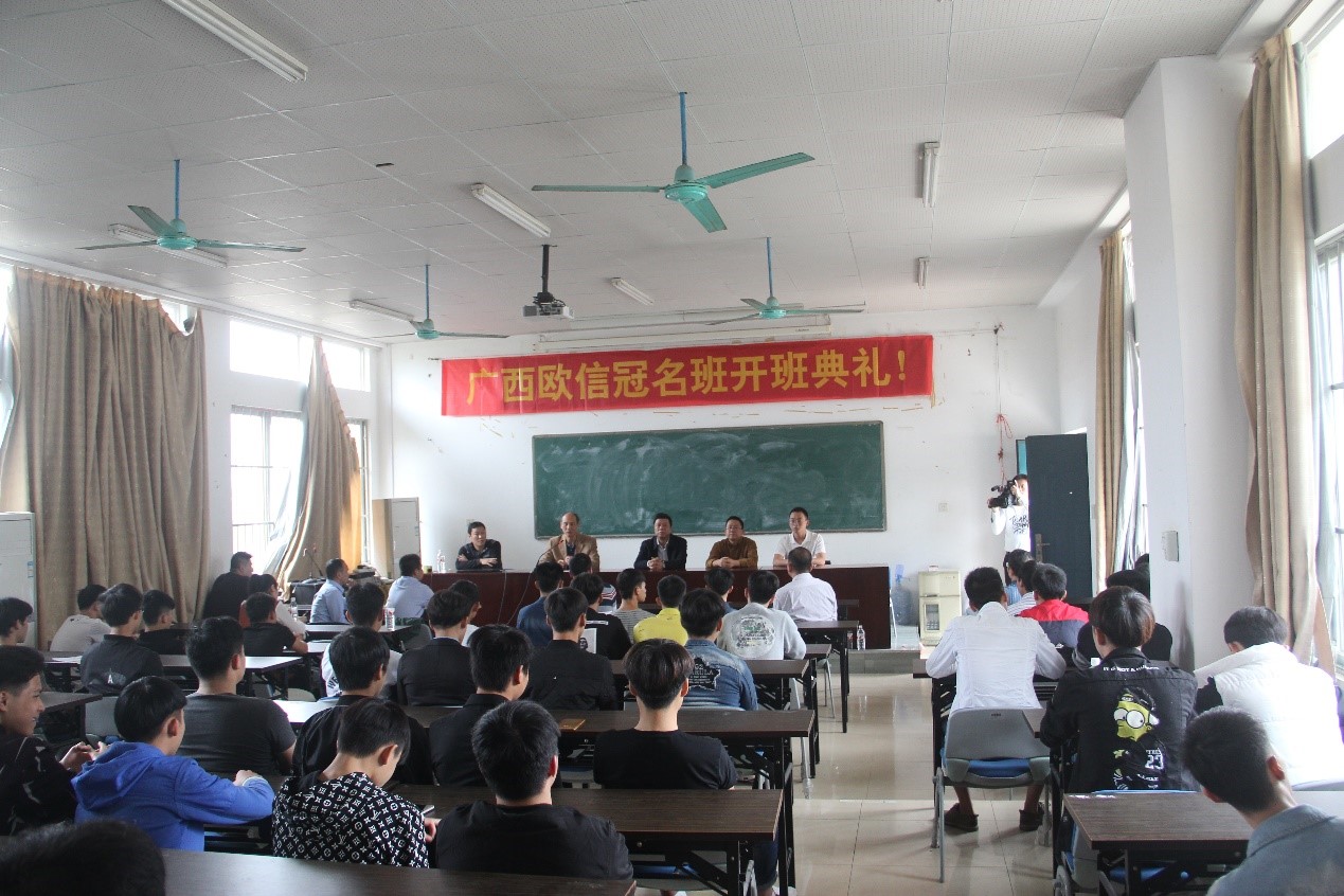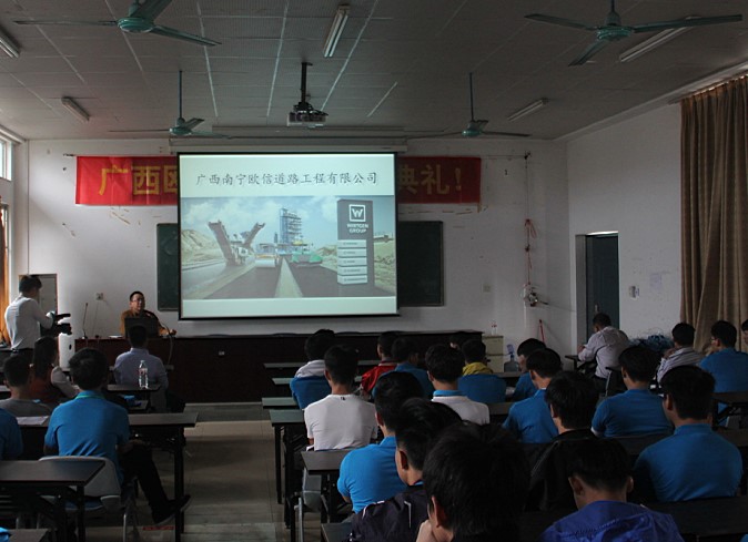 开班揭牌仪式结束后,广西南宁欧信道路工程有限公司总经理黄敏为欧信机械班全体学生上了生动的第一课,向大家介绍了欧信的发展过程和企业文化。作为同学们的学长,黄敏总经理以其自身经历鼓励大家要有梦想,要有抱负,要通过不断努力和奋斗来实现自己的人生价值。