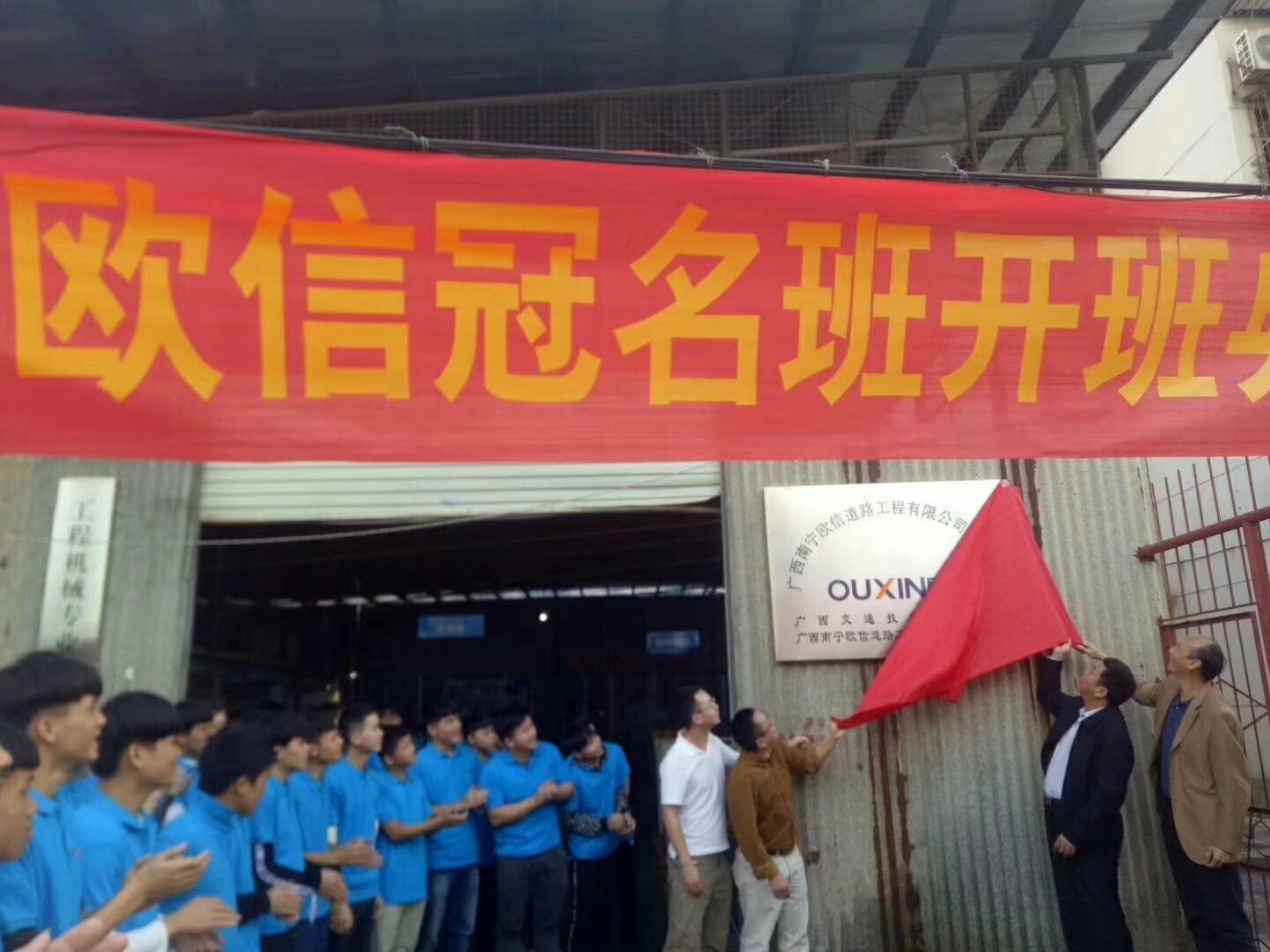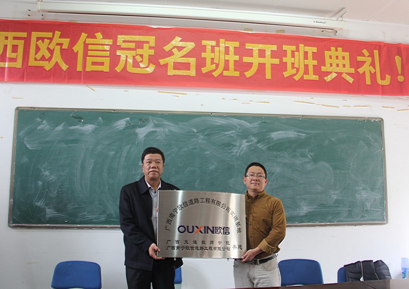 为加强企业与学院之间的沟通、交流,增加学生对企业的了解,2017年11月28日下午,我院在长堽校区办公楼多媒体教室举行广西“欧信”冠名班开班典礼和揭牌仪式。学院院长钟修仁、副院长关飞明,广西南宁欧信道路工程有限公司总经理黄敏、广西炜盈建筑工程有限公司总经理李孝平等领导出席了典礼和仪式,典礼由机电系主任周茂杰主持。