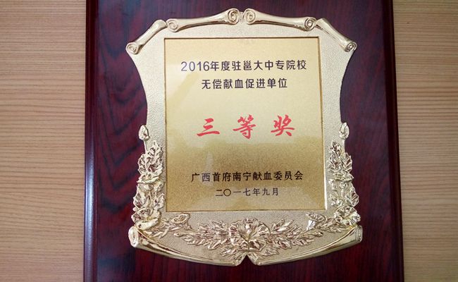 喜讯!2017驻邕大中专院校无偿献血工作会议于9月28日在南宁市桃源饭店会议厅进行,我院荣获2016年度驻邕大中专院校无偿献血促进单位三等奖的殊荣。