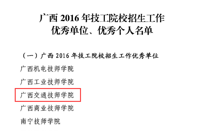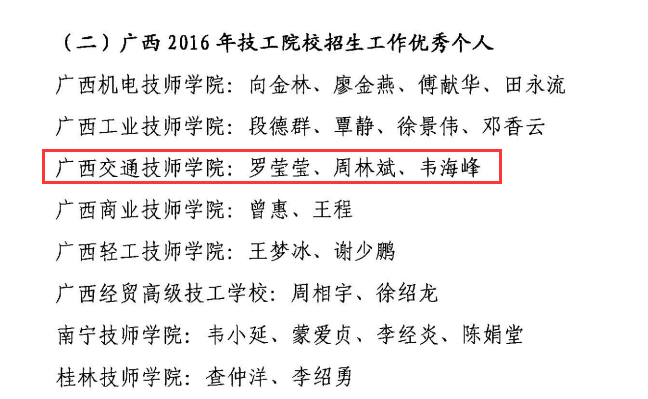 近日,根据2016年招生工作开展情况及办学环境等因素综合评价,自治区人力资源和社会保障厅对全区技工院校开展了2016年技工院校招生工作优秀单位、优秀个人推荐评选工作。我院荣获广西2016年技工院校招生工作优秀单位,学院罗莹莹、周林斌、韦海峰等3位教师荣获广西2016年技工院校招生工作优秀个人。