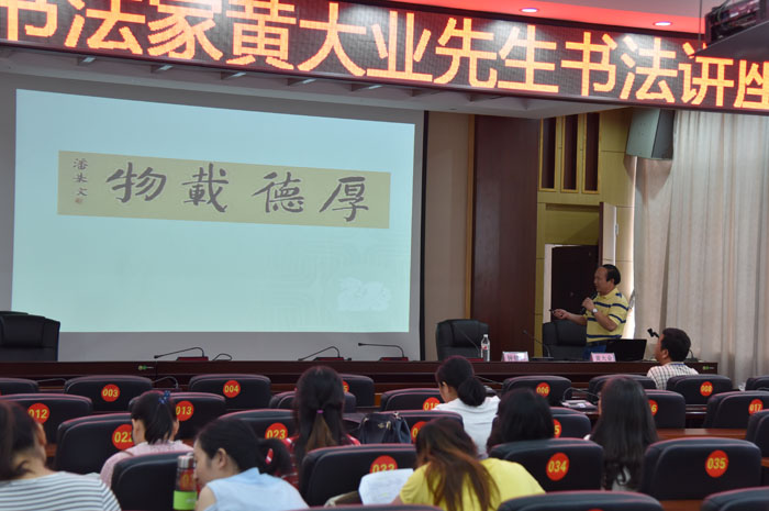 9月13日下午,南宁市书法家协会会长黄大业先生应邀来我院作题为《书法欣赏与学习 》的书法艺术专题讲座。讲座在学院信息中心四楼会议厅举行,学院院长钟修仁亲自带队,携同基础学科部全体教师、2017级新生班主任以及其他教职工到场一起聆听了黄大业先生的讲座。