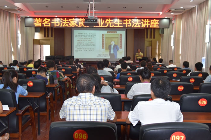 黄大业先生分别从“为什么要学习书法”、“书法的涵义”、“汉字的起源及书法的演变”、“书法作品的基本形式”、“如何欣赏书法”、“怎样学习书法”等六部分展开书法知识讲述。讲解的过程中,黄大业先生大量引用了古今书法名家的作品进行赏析,对书法线条和笔法做了深入浅出的介绍,从中国古文笔法等多方面阐述书法的精髓。他结合自己几十年的书法学习和创作的经验,重点讲解了怎样欣赏书法作品和怎样创作书法作品等问题。