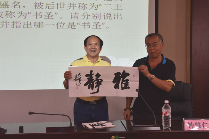 讲座上,黄大业先生还饶有兴致地发动广大教师进行知识竞答,并现场赠送其个人书法作品。教师们纷纷表示,黄大业先生的专业讲解,不仅使大家对中国传统书法艺术有了深刻的认识,还让大家切身感受到了书法的独特魅力,进一步激发了自己对书法艺术的浓厚兴趣,受益匪浅。