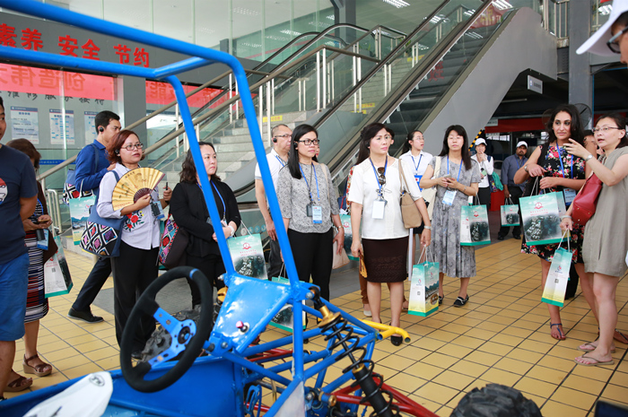 考察团成员观摩学院学生自主设计制作的巴哈赛车