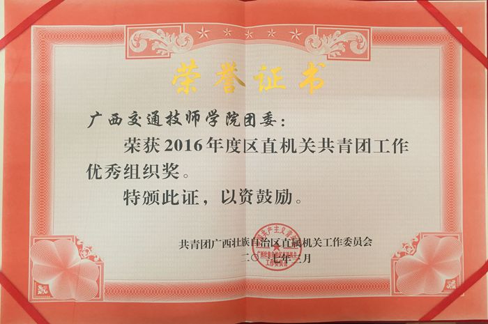 2016年,我院团委在学院党委和学院领导的关怀和帮助下,主动承担、保质保量地完成团区委和区直团工委交办的任务,为区直机关共青团的创新发展贡献了自己的力量,获得了年度区直机关共青团工作“优秀组织奖”,并且我院是连续三年获此殊荣的中职院校。