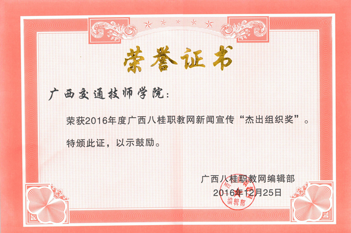 学院荣获2016年度广西八桂职教网新闻宣传“杰出组织奖”