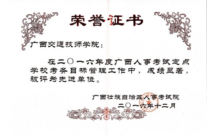 近日,我院由于工作成绩显著,在2016年度广西人事考试定点学校考务目标管理工作考核中,被评为“先进单位”。