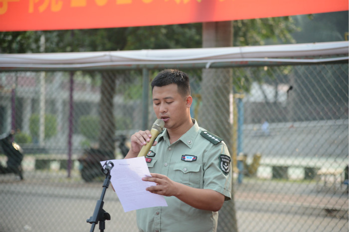 祺诚(南宁)国防教育训练基地领导贺秋平首先预祝我院此次军训取得圆满成功,并希望同学们要重视这次军训生活,在军中团结协作,发扬“流血流汗不流泪”的精神,树立“掉皮掉肉不掉队”的决心。同时,要求教官们在训练中要雷厉风行,严格要求,指导传授到位,口令指挥到位,人格影响到位,发扬人民军队的优良传统,圆满完成训练任务。