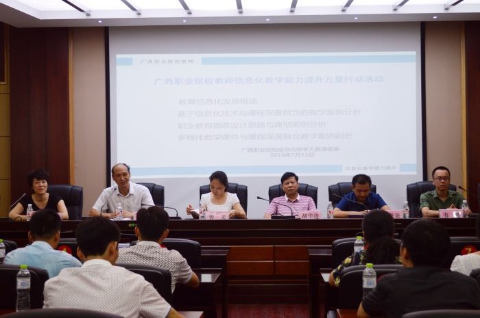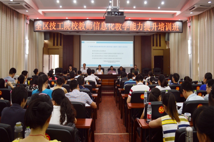 7月12日,由广西壮族自治区人力资源和社会保障厅技工教研室主办,我院承办的“全区技工院校教师信息化教学能力提升培训班”在我院顺利开班。培训班邀请到广西职业院校信息化教学大赛专家组组长、广西职业院校信息化教学大赛评审委员会评判长胡华进带领的广西职业院校教师信息化教学能力提升万里行活动专家团队,以及北京超星数图信息技术有限公司课程服务研究院副院长钱会博担任授课教师。