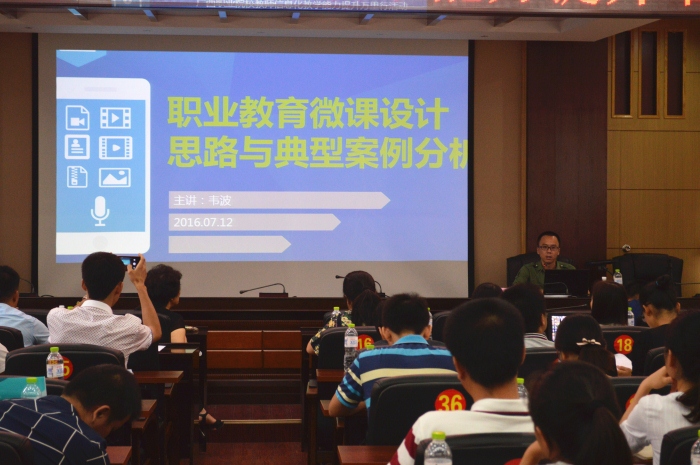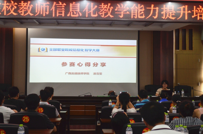 培训期间,广西职业院校信息化教学大赛专家组组长胡华进、广西职业技术学院副教授敖茂尧、广西机电职业技术学院韦波等几位专家老师对培训学员进行理论培训,他们分别从“教育信息化发展概述”、“基于信息化技术与课程深度融合的教学案例分析”、“职业教育微课设计思路与典型案例分析”和“多媒体教学课件与课程深度融合教学案例剖析”等方面进行了详尽的分析讲解。我院凌雪莹、梁华、刘婷等老师在现场与大家分享了参加国赛的经验,得到现场领导和老师的认可和赞扬。此外,我院信息与宣传中心副主任施伟在培训会上介绍了学院运用信息化管理手段开展学生管理与学生校外实习管理的经验,受到专家组的肯定。