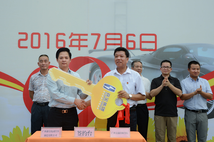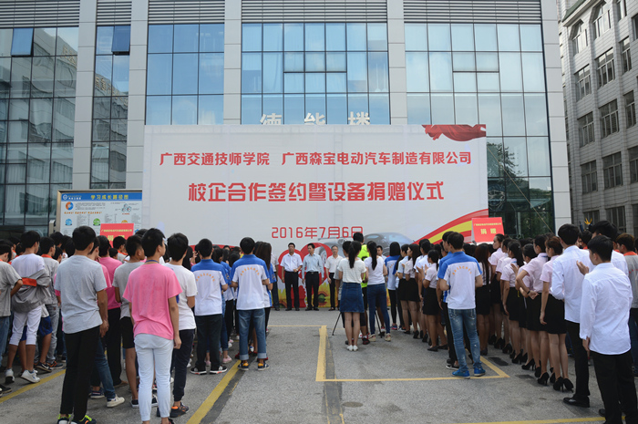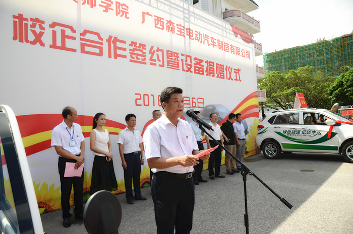 随后,双方代表签订了校企合作协议,广西森宝电动汽车制造有限公司在现场向我院捐赠了新能源汽车。