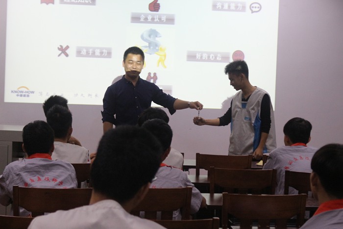 张明伟老师在课堂和学生进行互动,通过互动,使学生懂得机会是别人给的是不成功,只有自己创造机会才能成功的道理