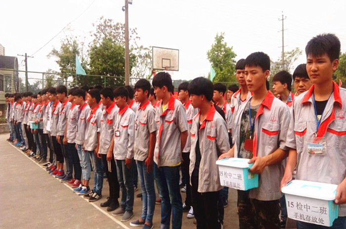 图三:上课前班级先集队点名再一起走去教室并要求学生把手机放到手机箱内统一保管