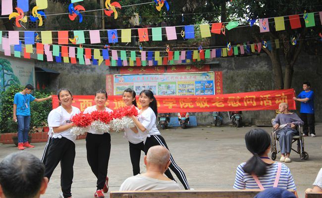 同学们带着全校学生爱心捐款购买的水果满怀热情地来到敬老院,为老人们送去真情的温暖和亲切的问候,给老人们带来了快乐。同学们满怀热情地走到老人的身边,嘘寒问暖,听老人们讲故事,同学们纯真的表情,亲切的话语,使得老人们乐不可支,其乐融融。学院啦啦操队和长堽校区街舞协会的同学还给老人们表演了精彩的节目,他们的努力给老人带来了喜悦、幸福和满足,整个敬老院充满了欢声笑语。
