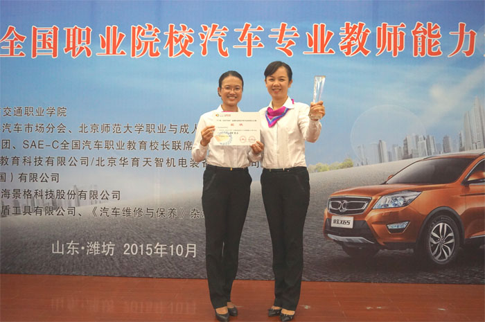 10月19至21日,为期三天的2015“北京汽车杯”全国职业院校汽车专业教师能力大赛在山东潍坊落下帷幕,我院教师林柳波、赵霞飞经过层层角逐,勇夺中职汽车营销专业赛项一等奖第一名,充分展现了我院教师的专业及教学风采。通过本次赛事,林柳波、赵霞飞老师均获得中国汽车工程学会颁发的汽车工程师认证,并授权免费参加由中国汽车工程学会组织的2016年所有培训及运华汽车营销软件课程一年的使用权。
