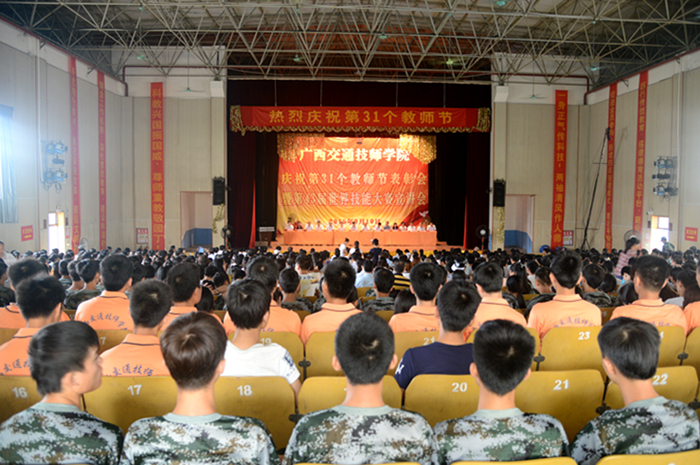 9月10日上午9时,我院组织2000多名师生在学院礼堂举办庆祝第31个教师节表彰会暨第43届世界技能大赛宣讲会,自治区人力资源和社会保障厅职业能力建设处处长张远,自治区交通运输厅科教处副调研员张迎春、科教处主任韦尧昌,自治区道路运输管理局局长黄天国等上级部门领导及我院全体领导班子成员出席了本次会议。大会由我院党委书记罗华主持。