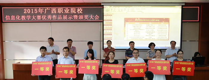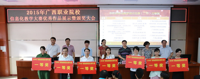 6月28日下午,由广西教育厅主办,广西高校教育技术专业委员会和广西经贸职业技术学院承办的2015年广西职业院校信息化大赛,在广西经贸职业技术学院颁奖大会落下帷幕。我校凌雪莹、何洪亮代表我院获奖教师参加颁奖仪式。