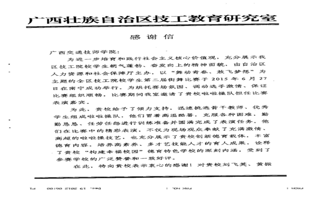 近日,自治区技工教研室给我院发来感谢信。信中对我院啦啦操队在6月27日出演的嘉宾节目表示十分的感谢,同时对参演的学生和指导老师给予了高度的赞扬。信中写道:“他们在比赛中的精彩表演,不仅为现场观众奉献了充满激情、高超的啦啦操技艺,也充分展示了贵校创新德育体裁,丰富德育内容,培养高素养、多才艺技能人才的育人成果,诠释了贵校‘构建幸福校园’德育特色学校的深刻内涵”。