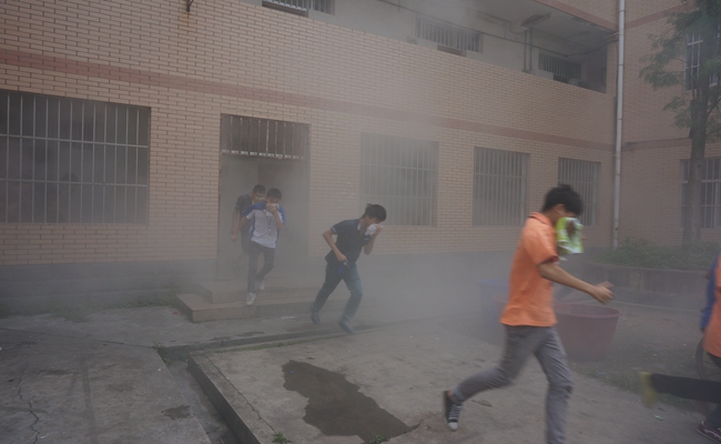 来自兴宁区消防队的农警官首先讲解了火灾发生的主要原因和火险逃生时的注意事项。随后,在班主任的组织下,学生们有条不紊地回到宿舍,班主任在楼梯各处站好,以协助疏散学生逃生,防止意外。各项工作准备就绪后,随着学生工作处副主任覃甫一声令下,逃生演练正式开始了。瞬间,宿舍楼浓烟四起,火警信号也及时响起。在这万分紧急的情况下,只见同学们用湿毛巾捂住鼻子涌向楼梯,井然有序地下楼梯,并按照学校消防疏散路线向学校操场走去。整个过程有条不絮,3分钟后全校学生已全部安全疏散到操场。没有出现一个学生留在现场,也没有出现因为拥挤而造成的意外事故发生。最后,农警官对这次演练进行了总结,针对同学们这次演练的一些不足之处提供了宝贵意见。