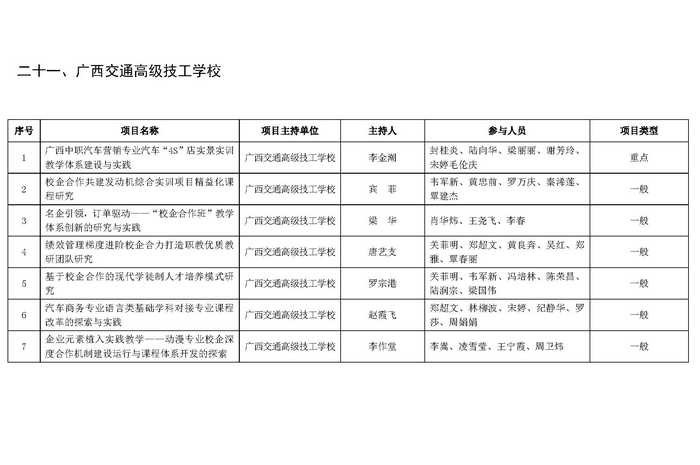其中,由信息商务系李金潮老师主持申报的课题《广西中职汽车营销专业汽车“4S”店实景实训教学体系建设与实践》获重点立项,教育厅资助经费3万元;汽车工程系宾菲等其他六位老师主持申报的6项课题获一般立项,每项课题由教育厅资助经费1万元。