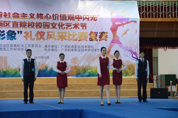 5月9日下午,第五届区直院校校园文化艺术节“强素质 树形象”礼仪风采比赛中职组总决赛在广西机电职业技术学院体育馆进行。经过初赛的角逐,共有10个学校的代表队进入决赛,每支代表队的人数为5人,每队由三女两男组成。决赛由礼仪装展示与团队介绍和团队个性服装展示两部分组成。在信息与商务系的刘飞英老师、周丽丽老师和陈蕾旭三位老师的带领下,13汽车维修与钣金中级工1班覃冰、14西式烹饪班黎东明、13高速公路服务班罗菲云、赵思琪、李岚五位同学组成了我院代表队参加决赛。