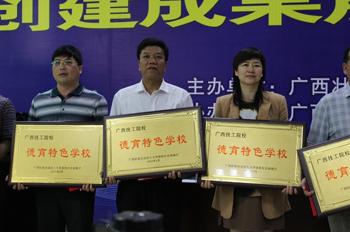 4月28日,广西技工院校“德育特色学校”创建成果展示交流活动在广西经贸高级技工学校举行,活动由区人力资源和社会保障厅主办,由为获得“德育特色学校”的11所技工院校进行颁奖、“德育特色学校”创建成果现场展示、创建“德育特色学校”典型案例介绍、德育课课改示范课及观摩学生管理工作和校园文化活动等五个内容组成。我院钟修仁院长、信息与商务系谢毅松副主任、学生工作处梁勇副主任、院团委李姜春书记及相关德育教师出席参加。