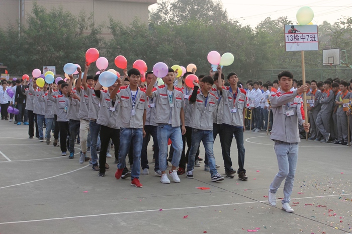 我院高峰校区仪仗队、彩旗队、裁判员代表队以及学生运动员方块队在激昂的运动员进行曲中依次入场。各方块队精神抖擞、口号响亮,整齐划一地走过主席台。