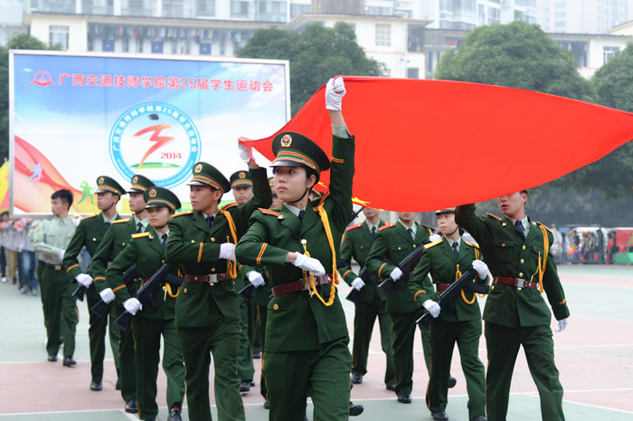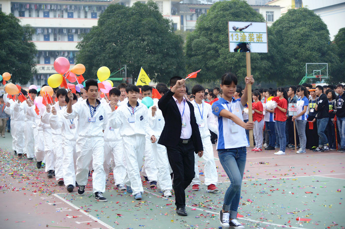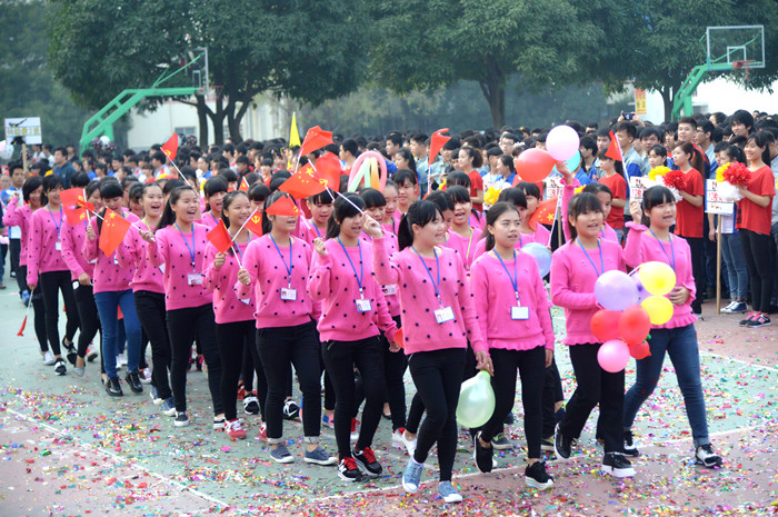 伴随着激昂铿锵的进行曲,学院国旗护卫队踏着整齐有力的步伐,手执鲜红的五星红旗缓缓进场,紧随前后的是彩旗队、鲜花队和裁判队。以班级为单位的方块队以昂首的姿态进入运动场,接受主席台领导的检阅,学生们整齐且富有创意的进场表演赢得了现场师生们的热烈掌声。
