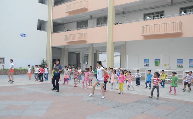 二年级的小朋友们在志愿者的带领下练习啦啦操步伐