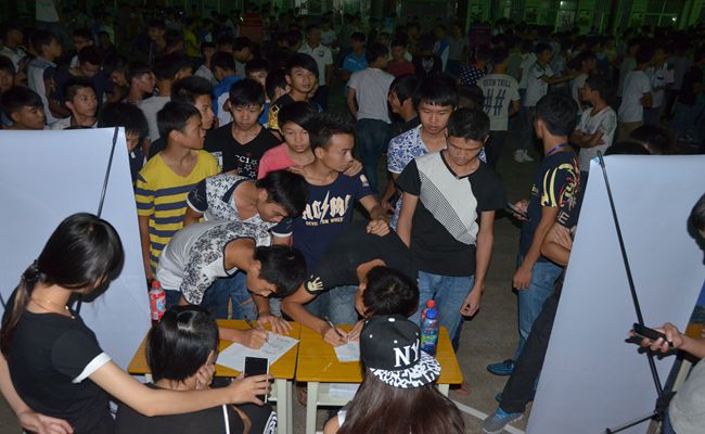 同学们在音乐协会展位前排队填写报名表