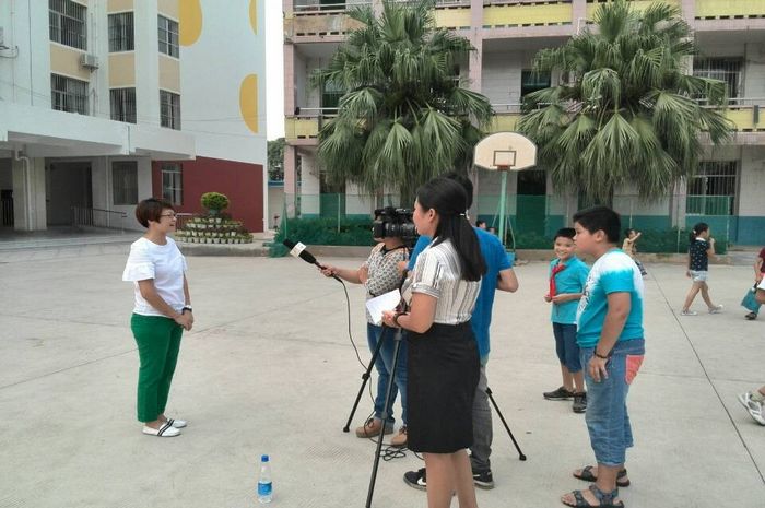君武小学少先队大队委黄老师接受我院电视台采访,对安全节能文明驾驶公益大课堂的到来表示期待和欢迎