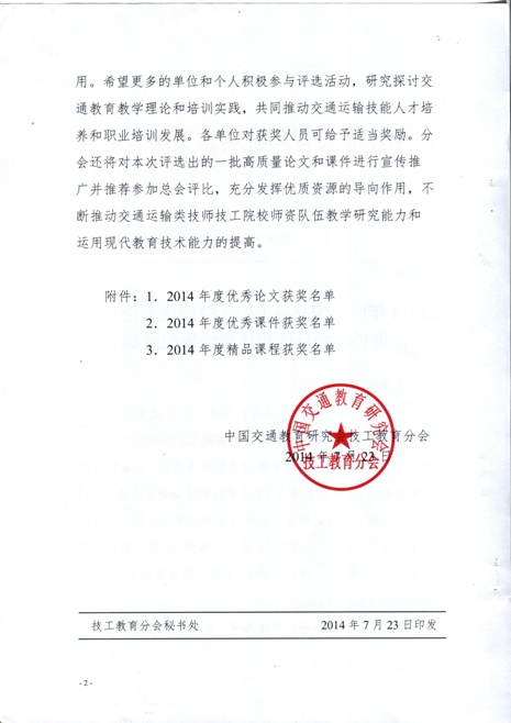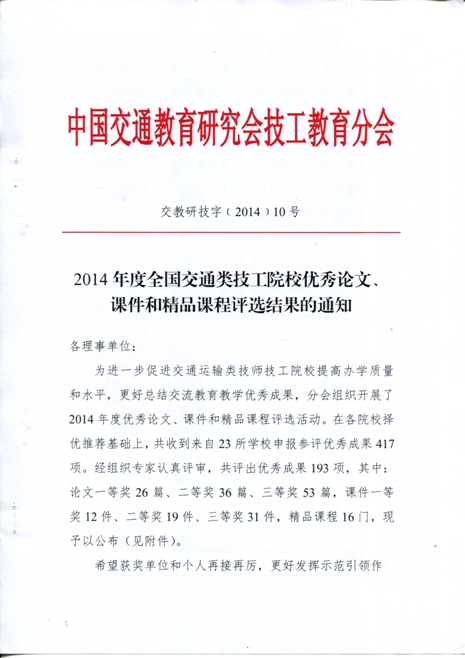 根据中国交通教育研究会技工教育分会《2014年度全国交通类技工院校优秀论文课件和精品课程评选结果的通知》(交教研技字[2014]10号),我院两项优秀教研成果荣获2014年度全国交通技工院校优秀论文评比一等奖。
