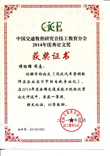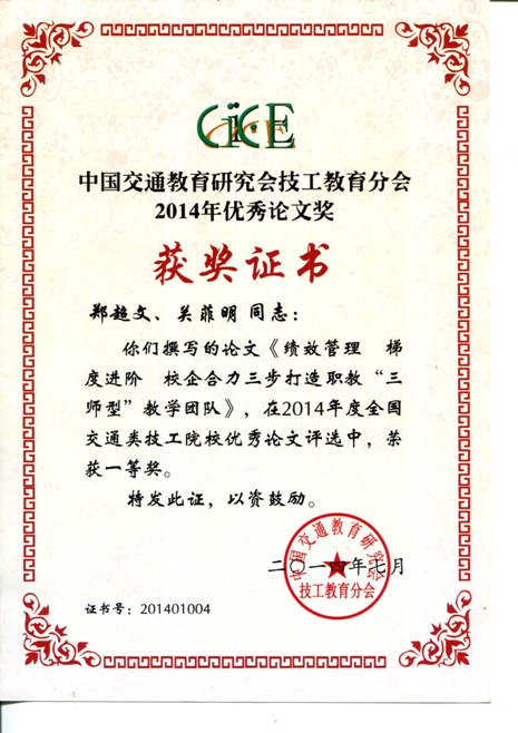 2014年度全国交通类技工院校优秀论文、课件和精品课程评选活动,由中国交通教育研究会技工教育分会组织。本次评选活动在来自23所院校推荐的417项成果中,经过专家认真评审,共评出优秀成果193项,其中我院关菲明副院长和郑超文院长助理的论文《绩效管理 梯度进阶 校企合作三步打造职教“三师型”教学团队》以及谭绍锋副主任的论文《浅谈汽车营销教师在企业实习中的自我专业化》,双双荣获优秀论文评选一等奖。