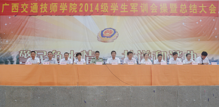 9月14日上午,我院2014级学生军训会操暨总结大会在学院本部操场及高峰校区操场举行。学院院长钟修仁、广西武警一支队队长覃振周、学院副院长关菲明、院长助理谭劲涛、郑超文以及学院部分中层领导出席大会。