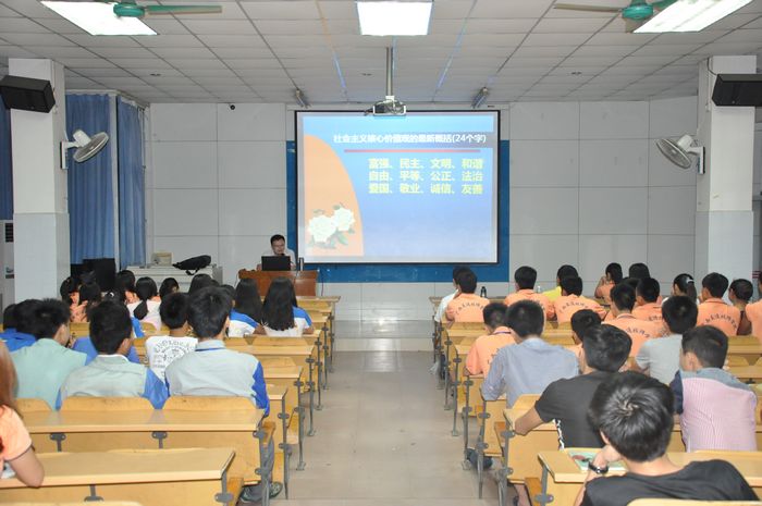 李毅老师围绕社会主义核心价值观深刻阐述了五方面内容,即社会主义核心价值观的理论发展、基本含义、理论内容、内涵特点、重要意义,通过引经据典、图文并茂、深入浅出对社会主义核心价值观进行了解析,并从倡导广大青年要凭着自己的高贵品质,努力实现人生价值服务社会、报效祖国。