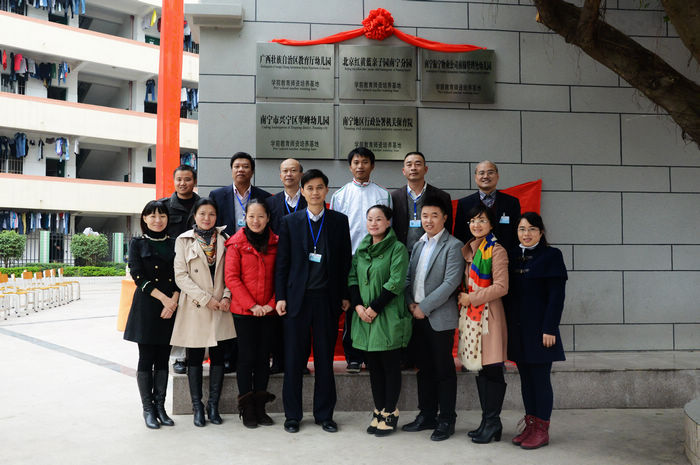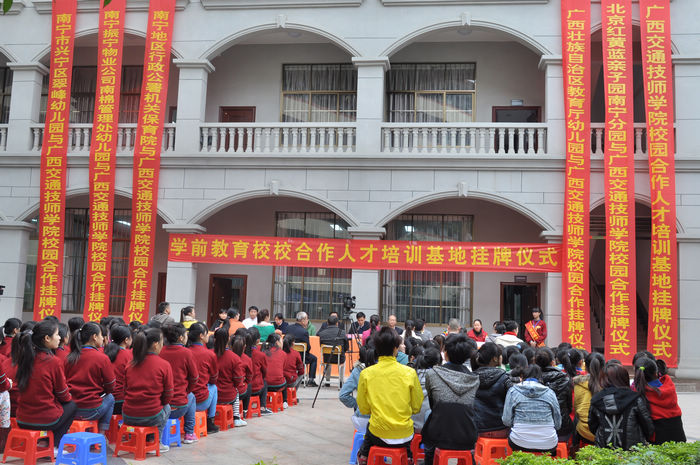 1月8日下午,我院与北京红黄蓝亲子园南宁分园等五所幼儿园在学院信息中心大楼前举行学前教育校校合作人才培训基地挂牌仪式。北京红黄蓝亲子园南宁分园园长荣辉、副园长黄程,南宁地区行政公署机关保育院副院长赵湘燕、主任黄小玉,南宁振宁物业公司南棉管理处幼儿园园长农瑜,南宁市兴宁区翠峰幼儿园园长梁圆鹦、书记冯可鸣、业务副园长韦喜平等应邀参加了仪式。学院院长韦红教,党委书记罗华,副院长钟修仁以及相关部门主要负责人和专业教师等出席了仪式。仪式由钟修仁副院长主持。
