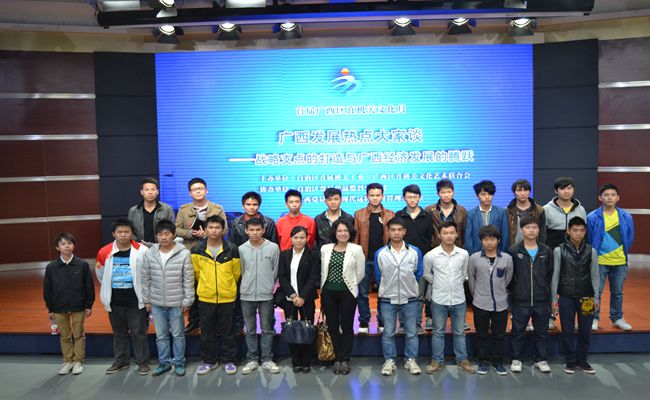 11月14日下午,我院师生代表30人在团委书记李姜春老师的带领下,来到自治区远程办演播室参加了“广西发展热点大家谈”活动。自治区人大教育科学文化卫生委员会主任委员刘树森,自治区人力资源和社会保障厅党组书记、厅长蒋明红,广西社会科学党组书记、院长吕余生作为嘉宾出席,自治区直属机关领导及各厅级单位的代表参加,自治区发改委外资处副处长荣毅宏主持了此次活动。活动由“主持人问、嘉宾谈”,“观众问、嘉宾谈”和“主持人问、观众谈”三个环节组成。活动一开始,嘉宾们就打造广西在西南中南地区开放发展新的战略支点的用意和内涵、如何打造广西战略支点及目前广西成为战略支点所面临的困难三个问题进行了畅谈;接着,现场观众从经济发展机制、环境保护问题和人才引进政策三方面向专家提出了问题;最后现场观众就主持人提出的“为了实现广西在全国的战略地位,还有哪些需要重点关注和加强的领域?”这个问题交流了自己的看法。