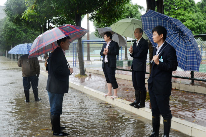 11月11日,受今年第30号台风“海燕”影响,南宁市持续普降暴雨,致使市区内交通堵塞,内涝严重。11日上午,我院校园内开始出现不同程度的内涝,学院领导高度重视,立即启动紧急机制,根据台风来临前的相关部署,组织师生抗涝抢险,维护校园生活秩序。自治区道路运输管理局党委书记孙永生、职业技能科副科长王东川到我院指导抗涝抢险工作。