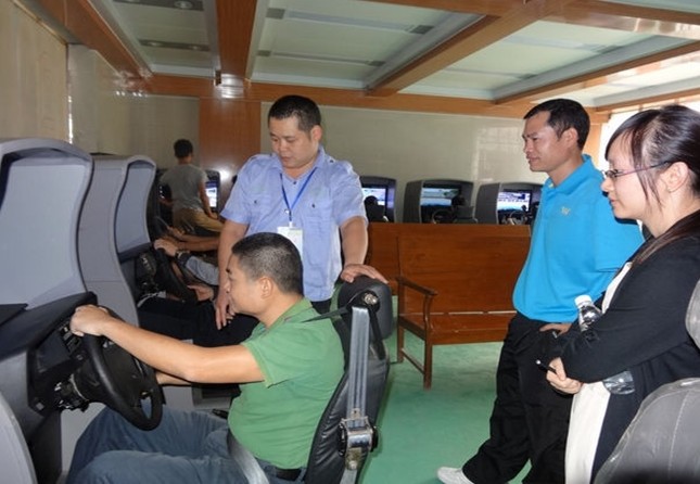 图为节能减排联合检查工作小组在体验模拟驾驶器