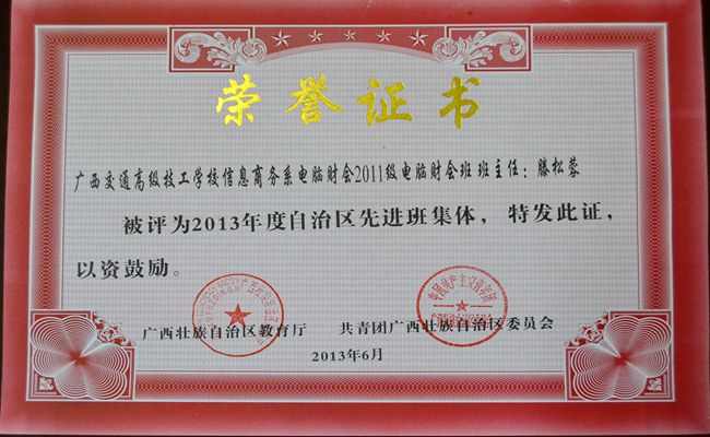 2011级电脑财会班被评为2013年度自治区先进班集体